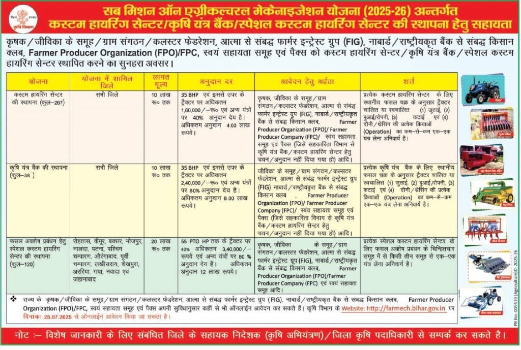 किसानों के पास आज आखिरी मौका है, इस योजना का फायदा उठाने के लिए। दरअसल, आवेदन के आखिरी तारीख 25 जुलाई 2025 है। जिसमें इच्छुक किसान बिहार राज्य सरकार की इस http://farmech.bihar.gov.in/ आधिकारिक वेबसाइट पर जाकर आवेदन कर सकते हैं। जिसमें यहां पर आपको सब मिशन ऑफ़ एग्रीकल्चर मैकेनाइजेशन योजना 2025-26 का विकल्प दिखाई देगा जिस पर क्लिक करके ऑनलाइन आवेदन पत्र जमा कर सकते हैं।
