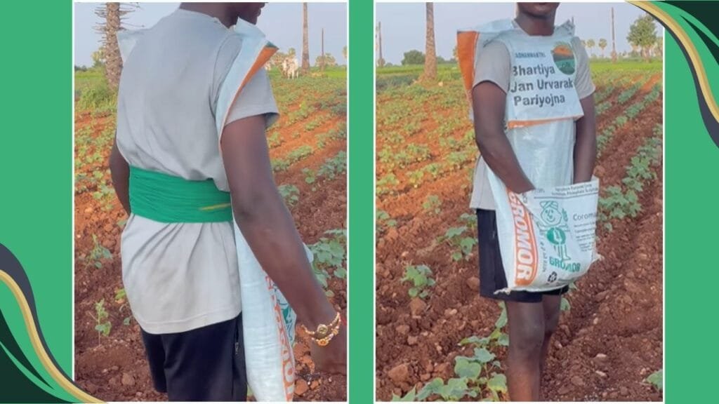 इस तस्वीर में आप देख पा रहे होंगे खेती के काम को आसान करने का कमाल का जुगाड़ बताया गया। इसे बनाने के लिए आपको बोरी को बस आपको काटना है। जिसके लिए बीच में बोरी को चौकोर आकार में काटना है। जहां पर आप देख सकते हैं व्यक्ति ने अपना हाथ अंदर डाला हुआ है और अंदर आप खाद भर सकते हैं। अगल-बगल आपको बोरी के ऊपर में हाथ डालने के लिए काटना है और इससे बहुत ही आसानी से खाद छिड़कने के लिए इस्तेमाल हो जाएगी।