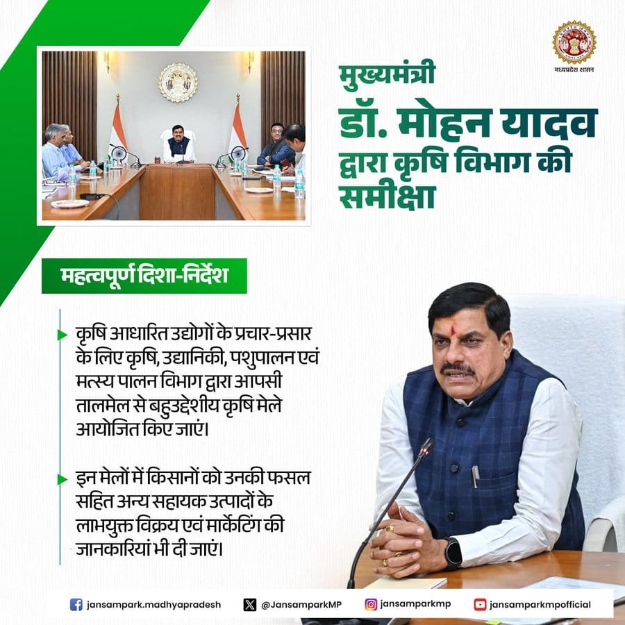 मध्य प्रदेश के मुख्यमंत्री डॉ. मोहन यादव द्वारा कृषि विभाग की समीक्षा बैठक की गई, जिसमें उन्होंने कृषि आधारित उद्योगों को बढ़ावा देने का फैसला लिया। साथ ही, कृषि, उद्यानिकी, पशुपालन और मत्स्य पालन विभाग को आपस में समन्वय स्थापित कर बहुउद्देशीय कृषि मेले आयोजित करने के निर्देश दिए। इन मेलों के माध्यम से किसानों को उनके उत्पादन का सही मूल्य मिलेगा और अन्य लाभकारी अवसर भी प्राप्त होंगे। जिससे किसानों की तरक्की होगी।