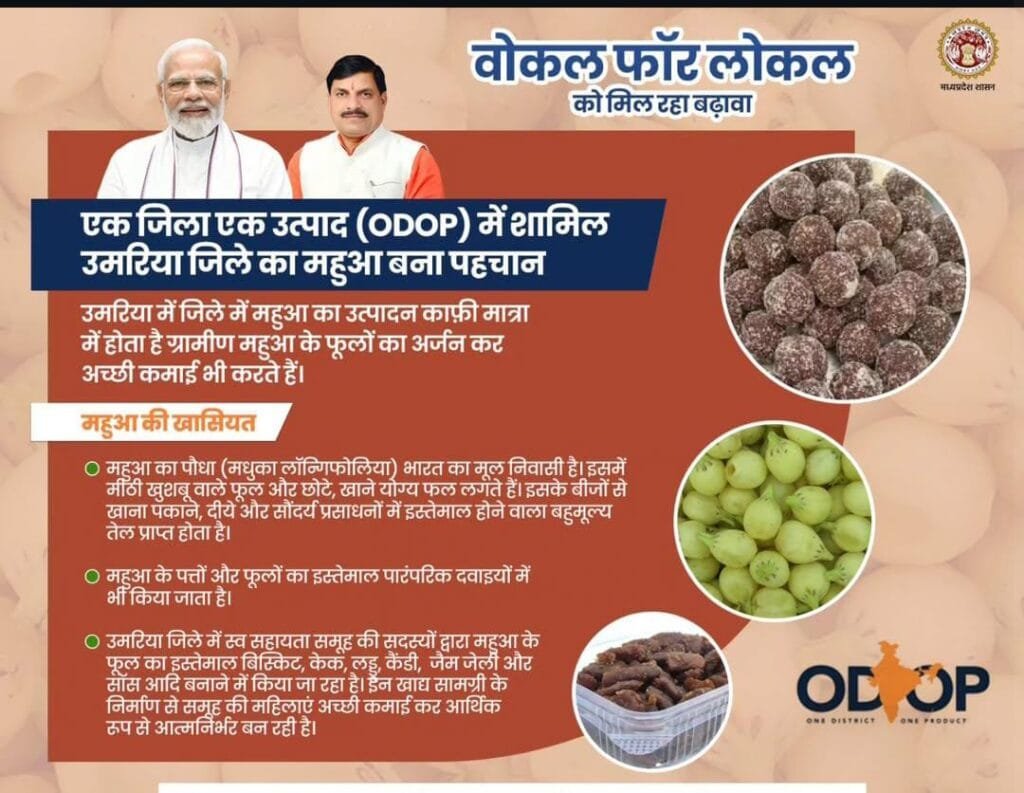 जैसे पन्ना का आँवला, वैसे ही उमरिया जिले का महुआ। महुआ का उत्पादन उमरिया जिले में बहुत होता है। इसके फूल और फल से लड्डू,तेल और परंपरागत दवाइयां बनाई जाती हैं। यह फसल किसानों और आदिवासी परिवारों के लिए आमदनी का एक बड़ा स्रोत बन चुकी है।