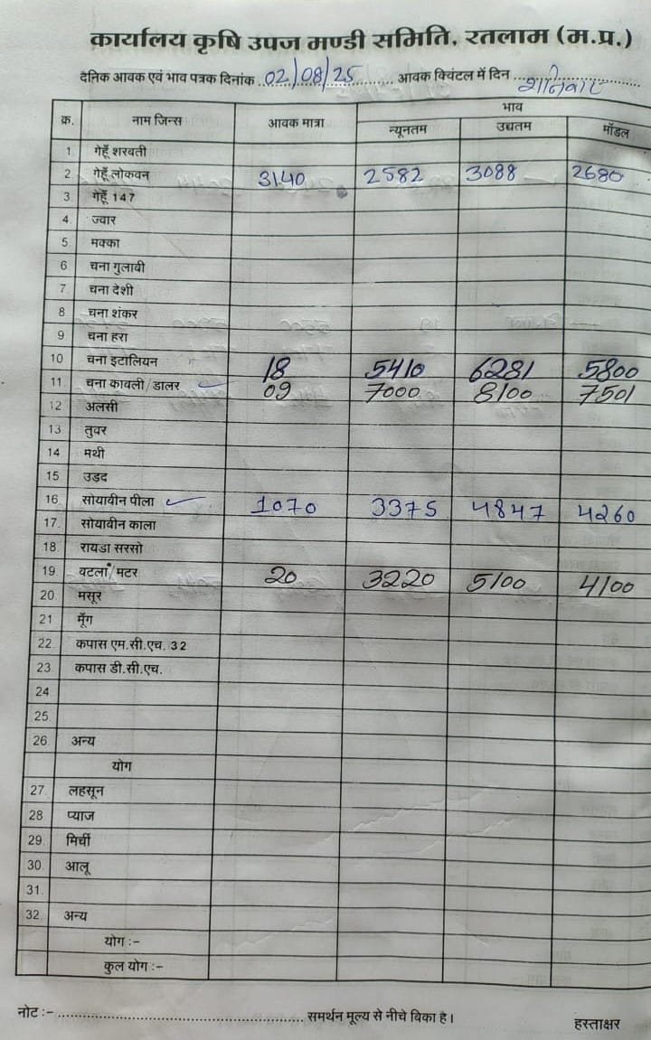 आज 2 अगस्त 2025 को रतलाम मंडी में सबसे ज्यादा आवक गेहूं और सोयाबीन की रही। चना काबूली की आवक सबसे कम रही फिर भी उच्चतम भाव में सबसे आगे रहा। निचे आज के मंडी भाव दिए गए है, तो चलिए रतलाम मंडी के सभी फसलों के भाव देखे।