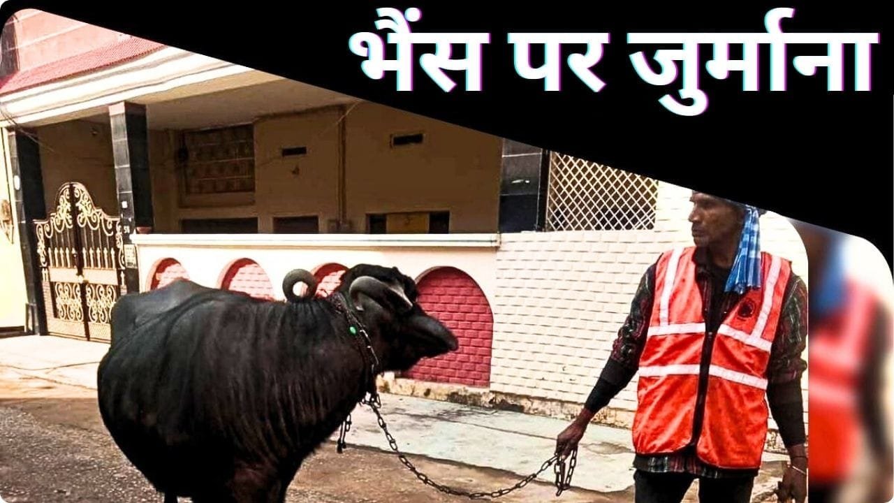 भैंस ने सड़क पर गोबर किया हुआ है तब टीम ने भैंस को जप्त कर लिया और इसके पशुपालक नंदकिशोर से ₹9000 का जुर्माना लिया। जुर्माना भरने के बाद भैंस को मालिक को वापस दे दिया गया।