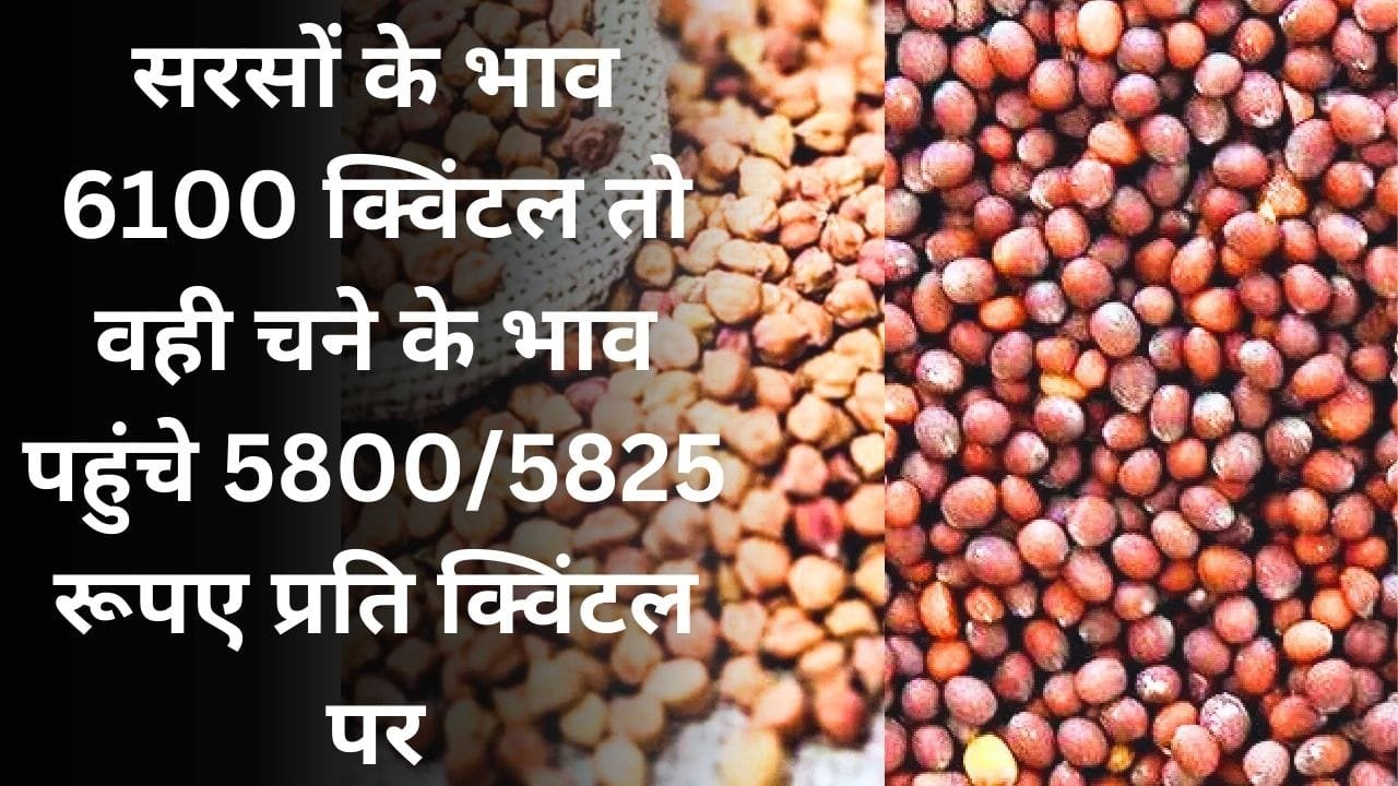 सरसों के भाव 6100 क्विंटल तो वही चने के भाव पहुंचे 5800/5825 रूपए प्रति क्विंटल पर। सरसो के भाव में लगातार कई दिनों से तेजी बनी हुई है। वही चने के भाव भी तेजी की तरफ लगातार बढ़ते जा रहे है। रोजाना मंडियों के भाव में बदलाव देखने को मिल रहा है। सरसो और चने के ताजा मंडी भाव के बारे में बात करे तो आइए आज के ताजा मंडी भाव के बारे में विस्तार से जानते है।